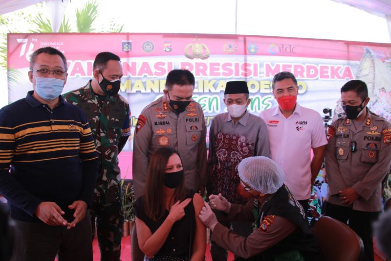 Lombok Tengah (NTB) Vaksinasi Presisi Merdeka Mandalika Goes To Green Zone ‘Pariwisata Ekonomi Kreatif’ digelar di 5 (lima) titik kawasan pariwisata kabupaten Lombok Tengah. Diantaranya, kawasan Mandalika Beach Park Kuta Kecamatan Pujut Kabupaten Lombok Tengah, UMKM/Bazar Mandalika, desa Prabu, desa Tumpak dan desa Mertak, pada Sabtu (21/8/2021).